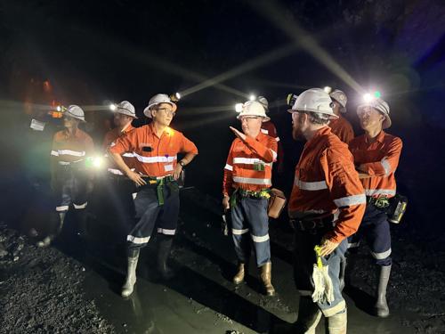第二日上午,张天航前往塞班地下矿进行现场调研,重点了解当前掘进进度、采场布局及矿石品位控制等关键生产环节。在现场,他与技术及生产团队深入交流。地下矿团队介绍了相关工作进展。团队始终坚持“采掘并举、掘进先行”的原则,为后续产能释放奠定了基础。当前地下开拓工程已实现对年度计划采场的全面覆盖,采场接续顺畅有序。同时地下矿扩能工作稳步推进,通过优化采矿方法持续提升资源回收率。设备方面,地下矿整体运行状态良好,设备可用率保持高位,新增地下矿矿卡及远程控制铲运机等设备均已投入使用。