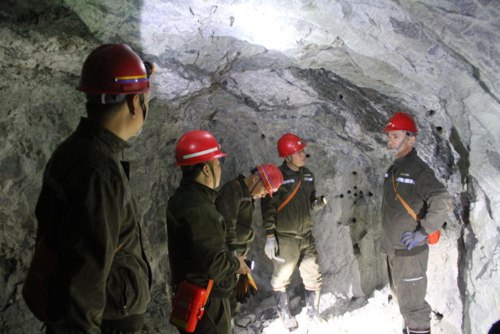 下午,王建华一行在吉隆矿业总经理孙立军、副总经理李化坤、李家和等管理人员及相关技术人员陪同下,到阳坡分矿盲竖井十中1851705采准工程现场调研。
